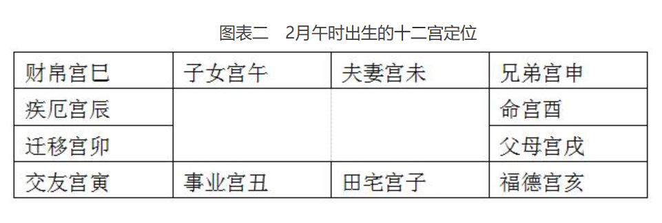 以命宫为起点逆时针代入其它11宫,即为十二宫的宫位(见图表二)。