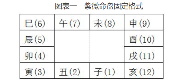 紫微斗数命盘很像一个方型的时钟,划分为十二格,象征时间的循环:一天有十二个时辰,一年有十二个月,每十二年就是一个地支等等,命盘固定格式见图表一。