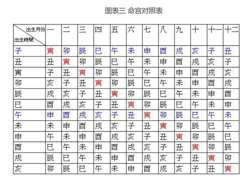 为方便起见,这里给出“命宫对照表”和“时辰对照表”(见图表三、图表四),读者可以直接查出命宫的宫位。