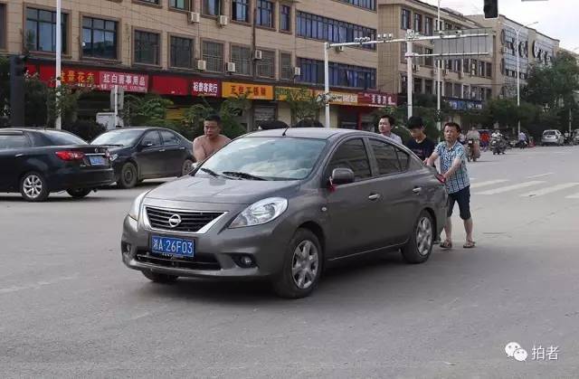▲7月2日15时55分,宁乡市,城区大部分车辆被水浸泡,四名男子正在推一辆被洪水浸泡过的车。