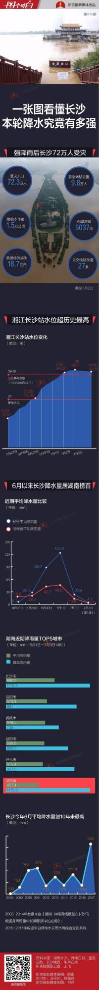 7月2日6时30分,湘江长沙站水位达到39.21米,突破了历史最高水位。而后,随着上游来水量不断加大,水位仍在继续上涨。同时,洞庭湖标志性水文站城陵矶站的水位一天之内也涨了一米多,防汛形势严峻。