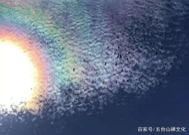 图片中,天空一片七彩光芒,鸟儿在祥云上空自由翱翔,画面实在太美!