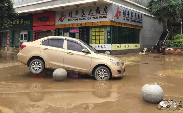 ▲7月2日11时,宁乡市,沿江路,一辆金色轿车被洪水冲上了路边的石墩。1日,这里的水位达到4米多。