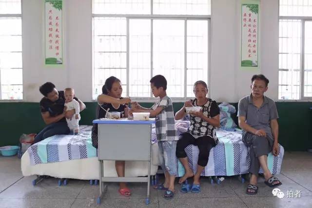 ▲7月3日12时左右,娄底市,新化县十五中安置点,临时搬到此处的杨先生一家六口正在教室里吃着发放的盒饭。杨先生一家来新化县打工已有七年。